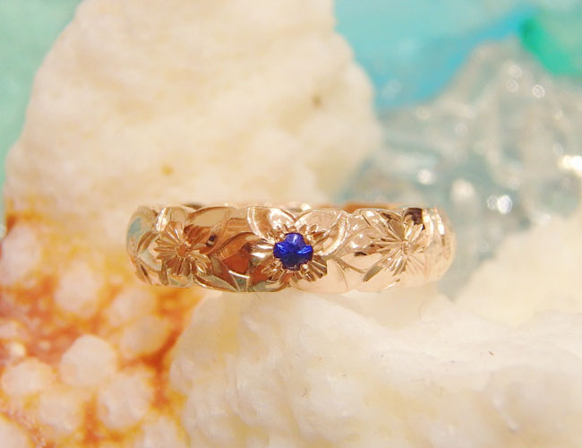 14K PinkGold Ring 4mm幅 M-110 HONU サファイヤ プルメリア3つ入り